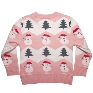 Pink and white soft winter/Christmas themed sweater with snowman and fir tree pattern. In excellent pre-owned condition.