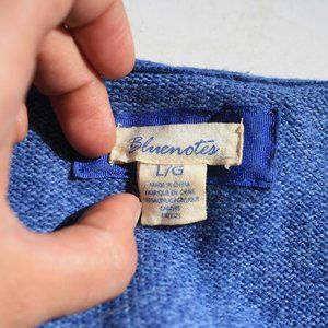 A blue long sleeved knit sweater, with hood and pom pom hood drawstring. Front pocket and cute people holding hands motif along bottom. Quite long so it fits a long torso really nice, and is quite warm with a low cut scooped neckline
