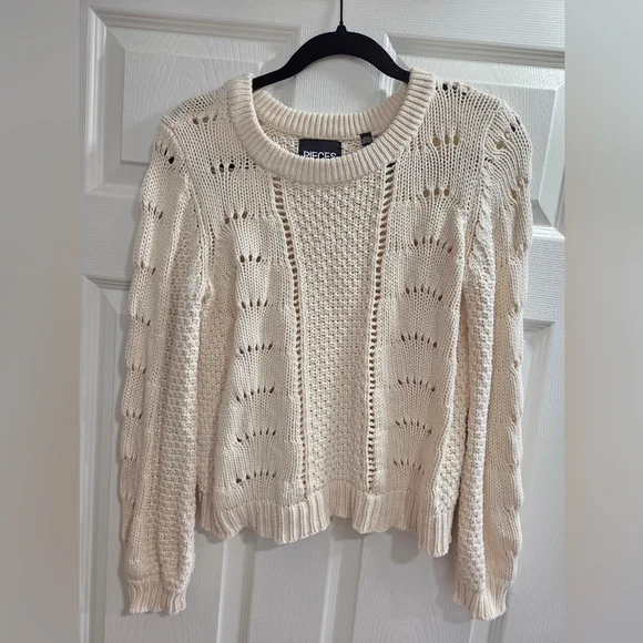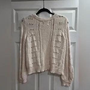 Stay cozy and stylish with this cream sweater from the Bay. unsure the materials tag is cut off on the inside. love this sweater but no longer fits me!