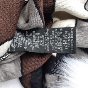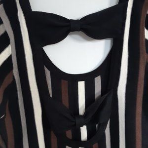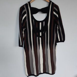 Knit, dress, flattering stripe design, open back with bow details. 3/4 lengths sleeve, skirt hem hits above knee. Brown, black, gray and cream. Knit allows lots of stretch.