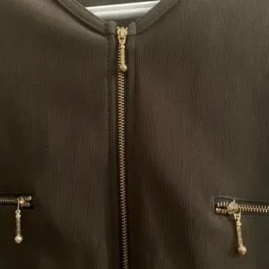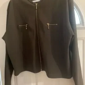 Unique knit design. Canadian made designers. I loved the quality of this piece I bought a second one in black! Best quality in knit stretch pieces I’ve ever owned. Exceptional dye quality keeps color and shape and washable ease of care. Hang to dry. Super for little work jacket, casual or travel does not wrinkle. Small rib detail in fabric, deep lasting color in choco brown, flattering length at hip. Brown jacket has gold/brass color zip detail. Lots of options. Nice little jacket