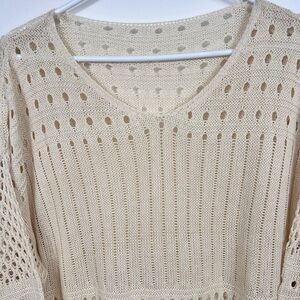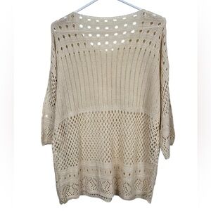 Tunic length cream summer sweater, vneck, pretty open knit, crochet style. No brand, tag says size XL, fits like a Large, check measurements. Excellent preowned condition