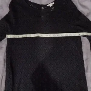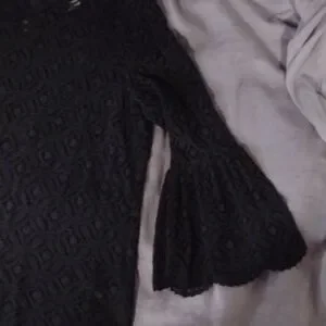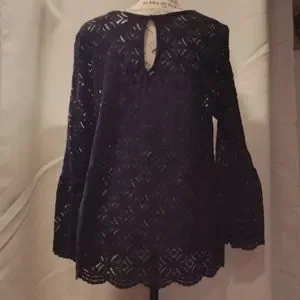 Black patterned top great for over a tank. Bell, three quarter length sleeves, teardrop opening on back.