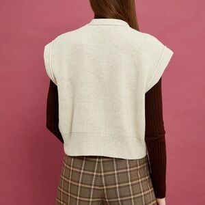 Knitted Cropped Vest With Rib Trim In Beige Stay stylish with this cropped knitted vest in beige. It features ribbed-style trims and a front button closure. This versatile piece is perfect for fall; wear it with a white shirt and a faux leather skirt for a chic look. Black pattern letters. Sleeveless style Relaxed fit Daily wear Fine knit Button placket