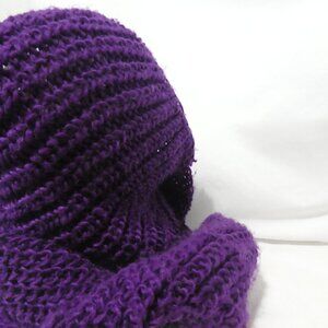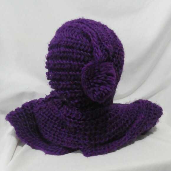 Knitted Purple Scarf with Hood and Pom-Poms