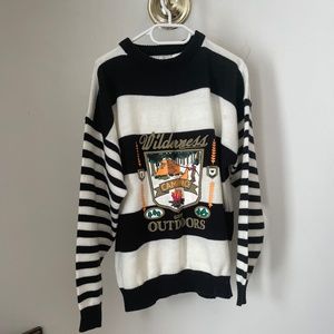 Striped black and white knit crewneck sweater, embossed 'wilderness great outdoors camping' crest. Good condition, no stains/tear.