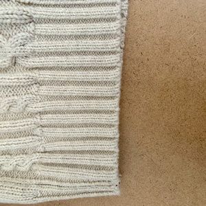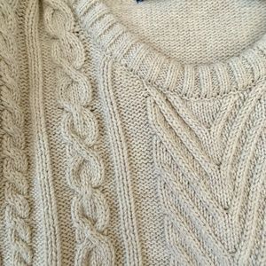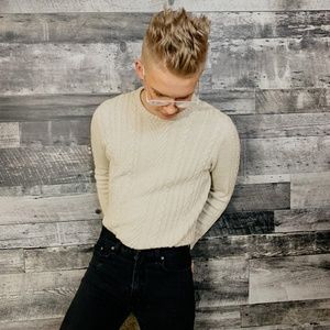 This is a mens Cream Izod Large sweater. The fits is supper nice but there is also room to put a dress shirt under to make it less casual. The fabric is lovely it's not at all itchy. The nice part is that this sweater looks great on both men and woman, If I were to wear it, I would tuck it into some black jeans with a jacket over top and little black boots.