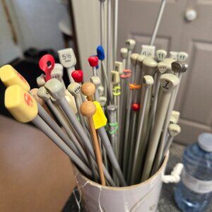 Over 30 pair of knitting needles plus other items.....check out the pictures....great bargain for someone.