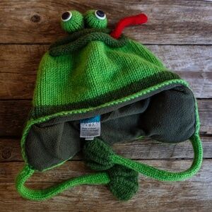 Cute and silly knitted frog winter tuque with button eyes and dangly legs. Made in Nepal. Great for kids or small/medium adult heads. Like new. Knitwits / Deluxhats