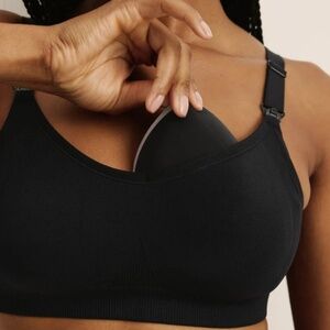 The nursing bra features wireless support for comfort, ease, and fuss-free feeding.