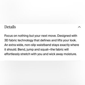 The high rise waistband is wide for shaping and support, and sits just above the belly button. Bonded seams help prevent chafing, and 3D fabric technology gives gentle compression and support to the glute and calf muscles. Fits True to Size Inseam: 25"