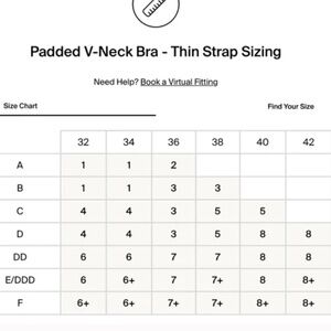 Size 6+ fits 32F, 34E(DD), 34F. See chart.