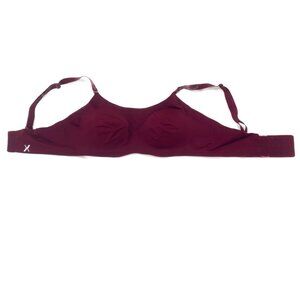 Comfortable, soft, wire-free bra by Canadian brand Knix. Beautiful rich wine red colour. Inside is a deep peachy orange colour. Silky smooth fabric that is structured to be supportive without using a wire. Adjustable straps and band.