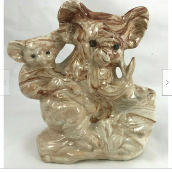 Mother & baby Koala Bear ceramic figurine with a brown swirl glaze finish. Very good pre-owned condition, no chips or cracks. Stands 5" tall x 4 3/4" wide x 3" thick.