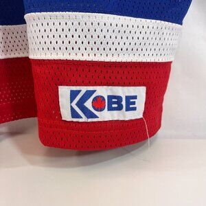 Pre-owned Kobe Red Adult hockey jersey with blue and white accents. Measurements are 24" pit to pit and 31" length. Jersey in excellent condition with a few loose threads. Please review photos closely for further details.