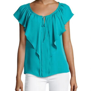 This 100% silk Kobi Halperin blouse can be worn both over and off the shoulder. It features beautiful cascading ruffles on a paneled front, adding a fluttery charm. The top also features a keyhole neckline with a drawstring tie, as well as a split hem. The top is made from luxurious silk and is a beautifully feminine and versatile piece for any wardrobe. Please note there is some damage to the tag as it is unattached on one side with some elastic poking out. Otherwise it is in EUC, size medium, measurements in photos.