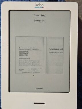 Kobo white eBook reader with a clear e-ink display. Lightweight design for comfortable reading. Long battery life for extended use. Easy-to-navigate interface and simple controls.