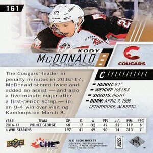 Kody McDonald (Prince George Cougars) 2017/2018 CHL Hockey Card- Card Number 161