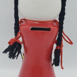 Approx. size: 3" (W) x 3" (L) x 9.75" (H). "PRE-OWNED" and in amazing condition! No chips, cracks or crazing. This fun and unique piggy bank is a pure treasure find for any piggy bank or doll collector, or for any person to use as a place to toss in loose change.