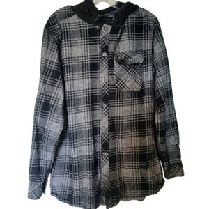 Kolby Men's Black and Gray Plaid Casual Flannel Hooded Button Down Shirt Size L