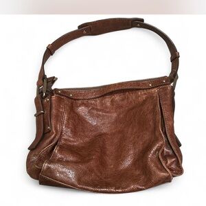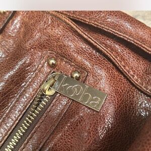 Stylish Kooba shoulder bag in rich brown leather. Features a sleek front zipper pocket. Ideal for everyday wear.