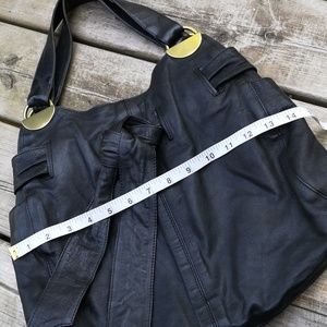 Funky black leather shoulder bag from Kooba. Very cool gold hardware. Magnetic pockets on either end. Magnetic button closure on top. Zippered and open pockets inside. Some very minor wear marks on bottom and a mark on bottom of lining (please see last few photos) but otherwise in excellent used condition. Measurements in photos. A fantastic and funky bag!
