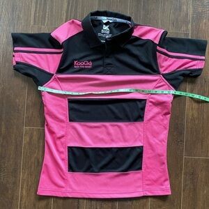 Kooga pink and black striped short-sleeve rugby shirt in size small. This collared shirt is made from a heavy polyester fabric that wicks away moisture. It features a pink front with a solid black back.
