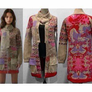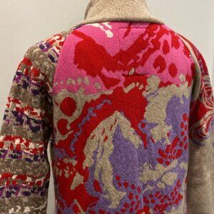 You found it. This is the coziest luxurious wool coat that features a unique patchwork design combining beige, pink, red, and purple lambswool knit. SUPER SOFT and stylish.