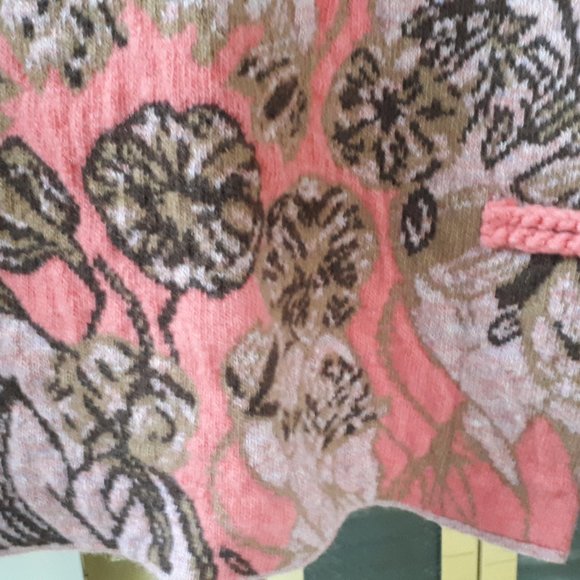 This is in beautiful near-perfect condition. It was purchased on Poshmark less than 6 months ago NWOT. It was not NWOT & frankly Posh might want to consider dispensing with that label due to frequent misuse. I have not worn it but I have washed it in cold water delicately with Woolite. Only imperfection is in final photo before measurements: a slight pull on the inner side of the outer collar piece and on the outside of the inner collar piece inch suggests there was a small closure or hook here previously. Says XXL on tag; may be closer to XL in N. Am. Pit to pit measures 21" laid flat; however, it is quite stretchy with the cables. See comment below.