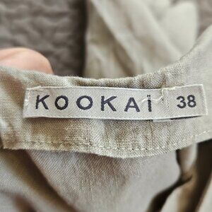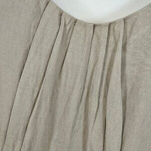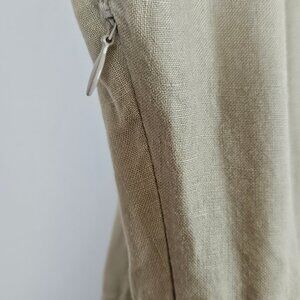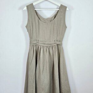 Pleated neck, empire waist, belt, side zip, 100% linen.