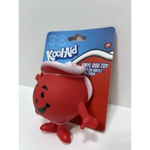 Kool-aid vinyl squeaky dog toy in a red pitcher-style shape with logo-type design. Durable and fun for interactive play.