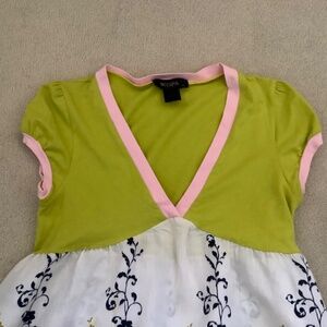 Floral print at skirt bottom, V-neck yellow green top with pink sleeve trim,