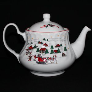 A lovely porcelain teapot made by Kopin, featuring a large decorated Christmas tree with a flowing red ribbon, and twinkling stars surrounding the tree. The other side features a charming quaint village scene of children building a snowman, sledding, playing, and a couple taking a horse-drawn sleigh ride. The fluted body of the teapot leads to a scalloped rim, with red trim. The lid shows two holly ribbons. It holds a substantial capacity at 7 cups (1500ml or 53oz). Height is 7" to finial, length from spout to handle is 10.25". Diameter is 5". It sells for $120 USD on a well known replacements site.