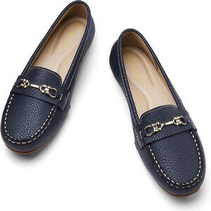 Kordal Women's Navy Leather Gold Accent Buckle Slip-Ons Walking Flats Loafers