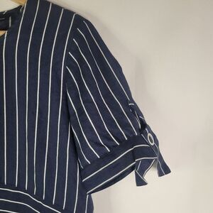 Stylish navy linen top with white stripes. Features an asymmetrical hem and short sleeves with unusual keyhole loops and crossbow detailing. White metal circle brads are not opening poppers, they are just decorative details. Korean size 66 is a US Medium. EUC