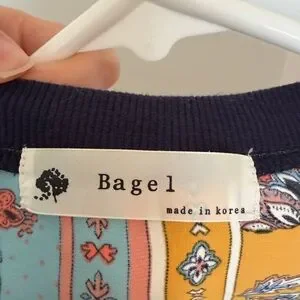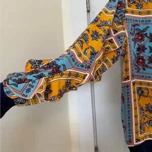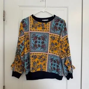 One size fits like XS-S, new without tag, made in Korean. Vibrant sweatshirt with a floral and geometric pattern. Features blue, yellow, and black colors.