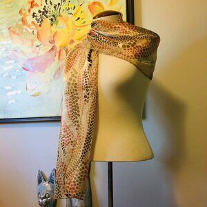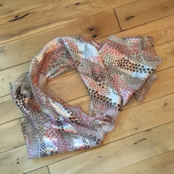Very good preowned condition, semi sheer striped, scarf with polka dots in cream, tan, pink and brown by Silk Feel. The material toggles between semi-sheer and opaque. The polka dots remind me of a make up palette. Very pretty.