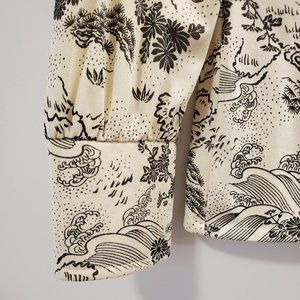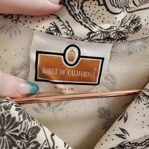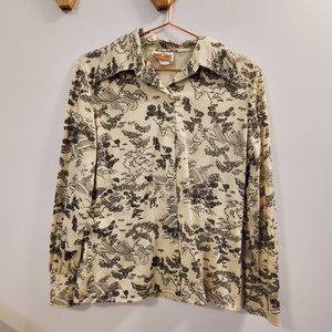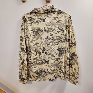 Unique, collared, button-up shirt. Ornate striking pattern all over.