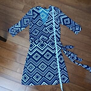 Kori America Bold Print Wrap Dress is a Size Small. It is very sexy and figure flattering. The print is a bold geometric design in navy and white. The material has stretch. You will surely stand out in this little number! Made in the USA. See measurements but also remember this is a true wrap dress and can be adjusted. New to poshmark? Sign up with my code Jstewart261 to receive $15 off your first purchase.