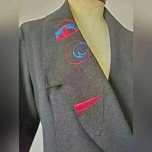 Gorgeous lightweight jacket. Blue and red accented detail. sits below the knee. polyester blend. distressed silver buttons.