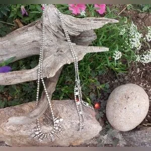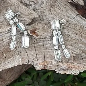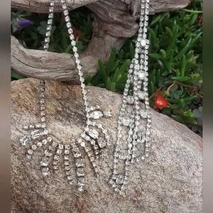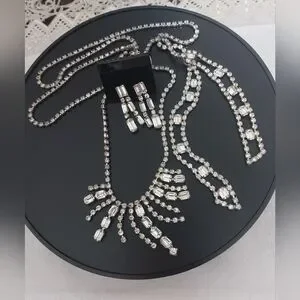 This Exquisite Vintage Rhinestone Necklace glitters with intensity as do the matching earrings. The necklace has several rays of prong set clear round and large baguette shaped stones that dangle enticingly at the front while the back features two double rows of rhinestones joined in the middle with bagette rhinestones. The necklace is 46 inchs long and closes at the back with a snap clasp that works smoothly and closes securely. All of the rhinestones are clear, bright and tight in the setting. This is high end fashion jewelry made with precious metals and genuine rhinestones. Beautiful and Elegant for any Formal Occasion!