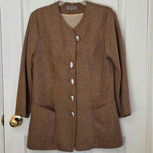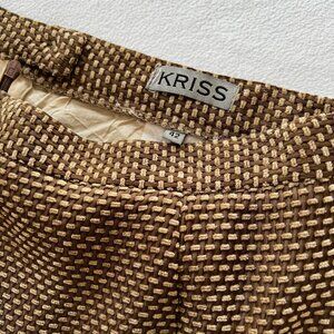 Kriss women's clothes from Sweden are high quality, flattering feminine fit with lovely patterns. This light brown suit is very soft to the touch and comfortable. Suit jacket is European size 38 and the skirt is size 42 with about a 31'' waste. Made of cotton and polyester. Both jacket and skirt are lined. The top elastic button loop is slightly frayed. Otherwise both pieces are in excellent condition.