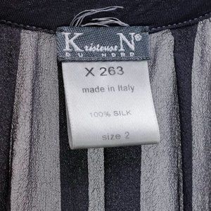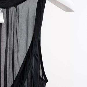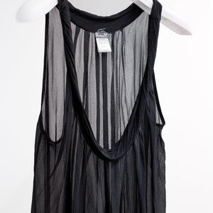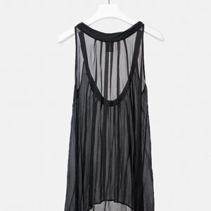A lightweight scoop-neck tank in sheer black silk with a pleated front and back, and a handkerchief hem.