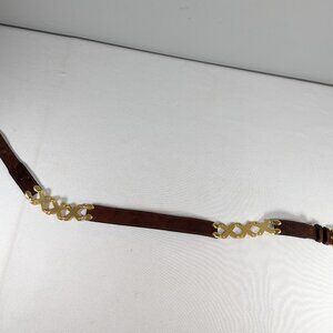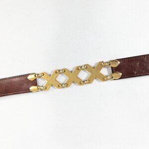 A rich chestnut toned brown leather belt with satin gloss gold toned triple X sections. The metal is marked made in Spain. The branding on the inside of the belt is worn, I think it reads KUDOS. Overall in nice condition with marks of age and use. The shortest it´ll go is 28 inches, the longest is 31 inches