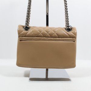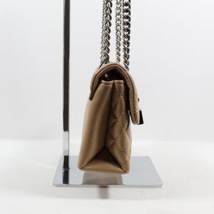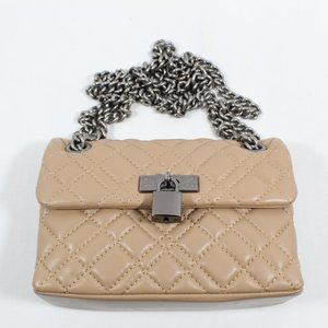 A quilted leather bag with a lock hardware offers a chic, refined style while carrying all of your things to go.