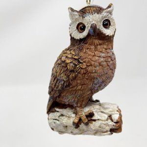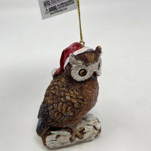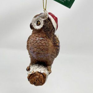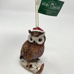 Celebrate Christmas with Kurt S. Adler resin woodland Owl wearing a santa hat sitting on a log christmas tree ornament.