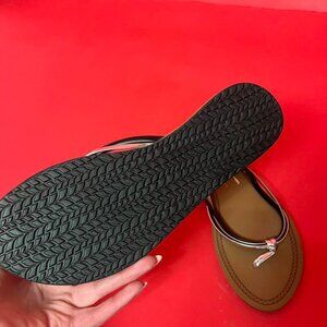 Super cute and comfy summertime sandals with brown base, black soles and silver strappy top pert. Amazing condition and quality, next to new other then the branding sticker peeling off some of the brown area. Gives me dainty summer beach vibes but super practical and versatile.