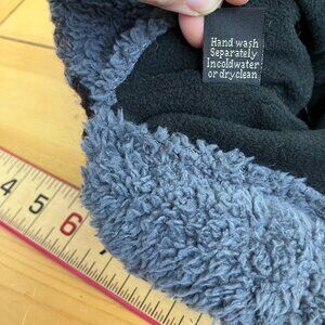 Kyber brand knit winter hat has large pom pom on the top with two pom pom ties at the back of hat. Ties can be tied under chin when needed, or tied at the back of hat. Decorative button & stitching detail on the left side of hat, logo patch on the right side. 100% wool knit outer with full polyester fleece lining. Hand washable. Made in Nepal. One size fits most adults - hat circumference is approx. 22" unstretched. Good pre-owned condition, fabric has some pilling from normal wear.