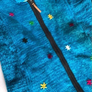 Very vibrant pattern on this very warm jacket. I love these jackets as they are perfect for layering or just throw it over top of a shirt and head out! The polar fleece lining makes it extra cozy. Star sort of design on the front. The polar fleece appears to never have been washed. One small stain on the back near the bottom but it may come out with a wash. Excellent condition otherwise.