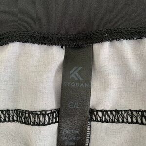 Kyodan Camo Capris. Size L. (Black and Grey). Sport Material. Pull on, elastic waist. Mesh detail at bottom of legs. Elastic cuffs. A bit of wear on the seat, at the seam (see picture).
